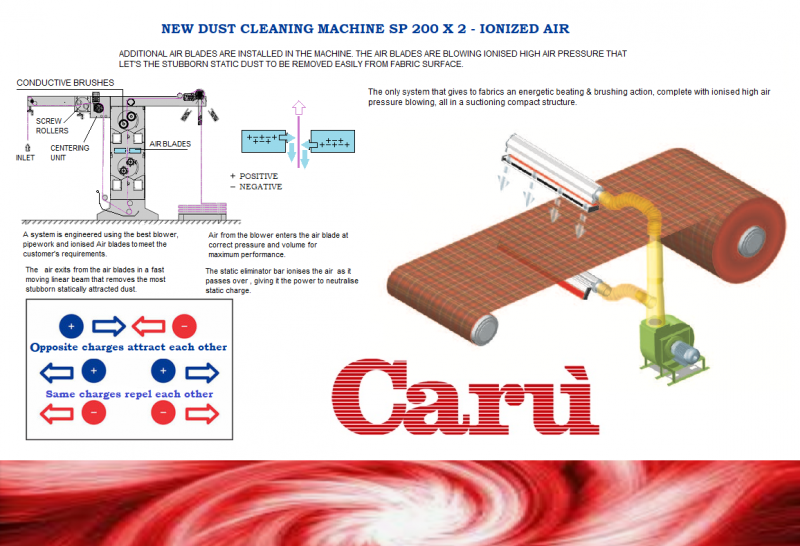 Some parts for their particular constitution and function, are galvanized coating and the frames are treated with epoxy paints.Additional air blades can be installed in the machine; The air blades are blowing ionised high air pressure that let's the stubborn static dust to be roved easily from fabric surface.